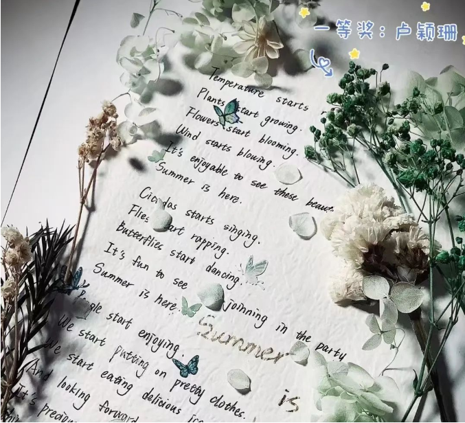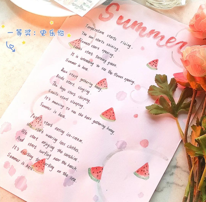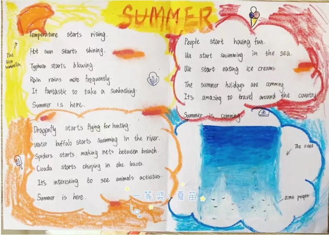 史乐怡同学的创作感想:这是一首关于夏天的诗。夏天是我最喜欢的季节,虽然说夏天每一天都是烈日炎炎,有时还会有倾盆大雨,但夏天却给我一种爽朗活泼的感觉。首先,夏天,人们都换上了单薄的衣服,如T恤,短袖。走在街上,随处可见的花也都盛开了,绽放出了她们最美的一面,植物们也都已经长大,知了欢快的歌唱,一派生机勃勃的景象。这便是我写这首诗时脑海中呈现的画面。