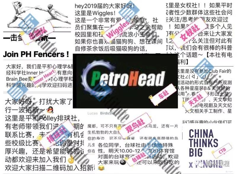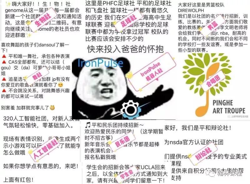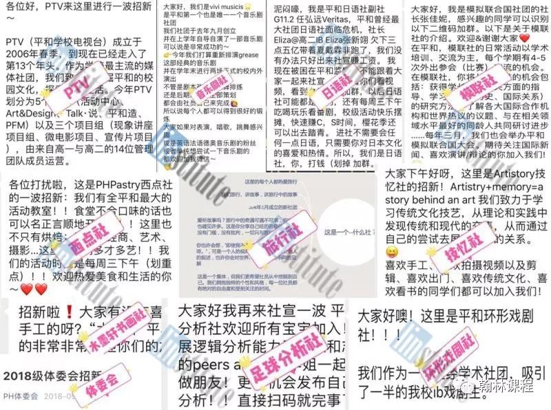 平和学校以社团多为特点闻名上海的国际学校。开学的时候,有一百多个社团都贴出了招新海报,在新生群里刷屏,如图所示。