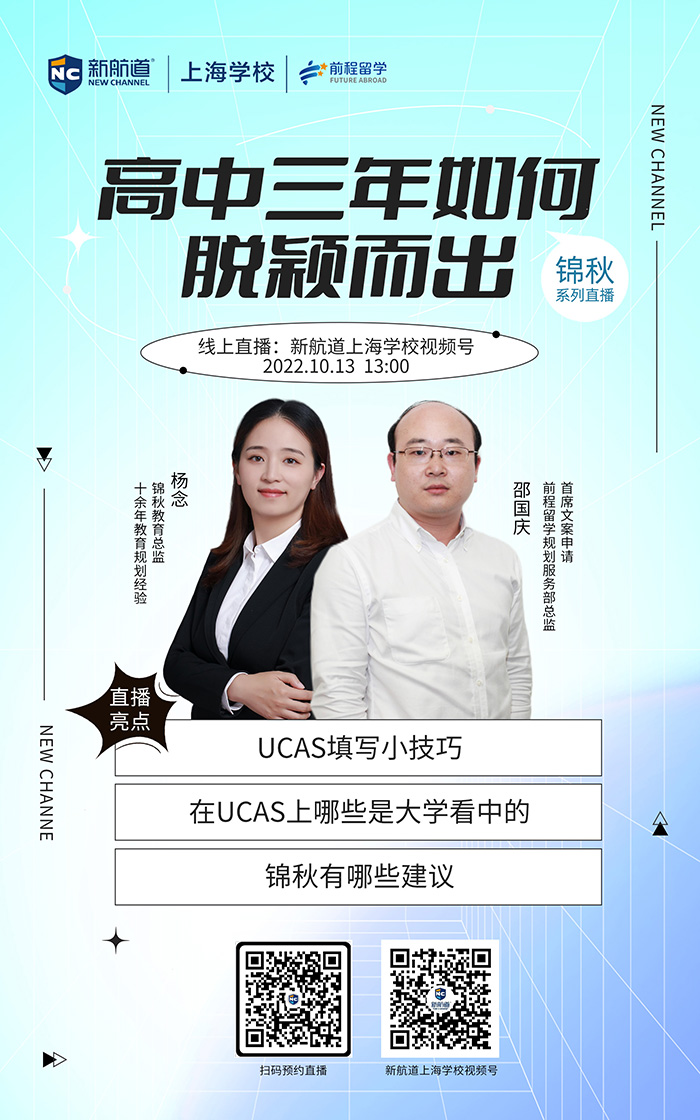 讲座简介:邵国庆 新航道上海学校规划服务部总监,十四年留学工作经历,专注于美国及英联邦国家的留学申请 杨念 锦秋教育总监 十余年教育规划经验