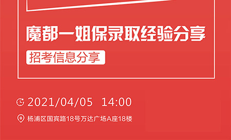 徐汇区裕德路126号氪空间 2021.4.3 13:30-16:00主题:魔都一姐保录取经验分享