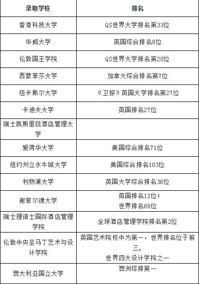 近日,美国、香港、英国、瑞士名校的录取纷纷揭晓,张新外国际部每天喜报不断,2016届高三总共17名毕业生, 截止日前收到了美国、香港、英国、瑞士顶尖名校的录取通知,录取成绩依然保持良好态势。部分学生的录取学校及排名如下表。