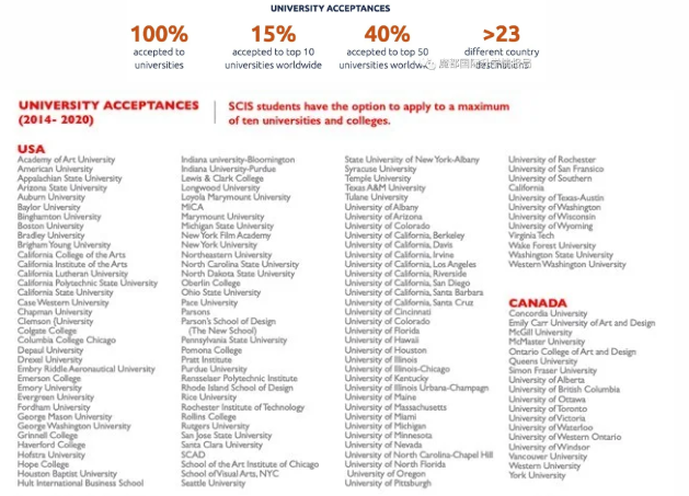 SCIS毕业生将获得进入世界主要大学所需的高中文凭。此外,大多数SCIS毕业生获得完整的IB文凭,认为是世界上最严格的学术文凭,被来自90个国家的3300所顶尖大学接受。