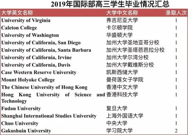 国际部2020届的高三学生全部被国内外大学录取,有中国方向的清华、复旦、上海交大、上外、上海纽约大学、香港中文、香港科技。另外还有美国方向、澳大利亚方向和日本方向。 2019年国际部高三学生部分毕业情况: