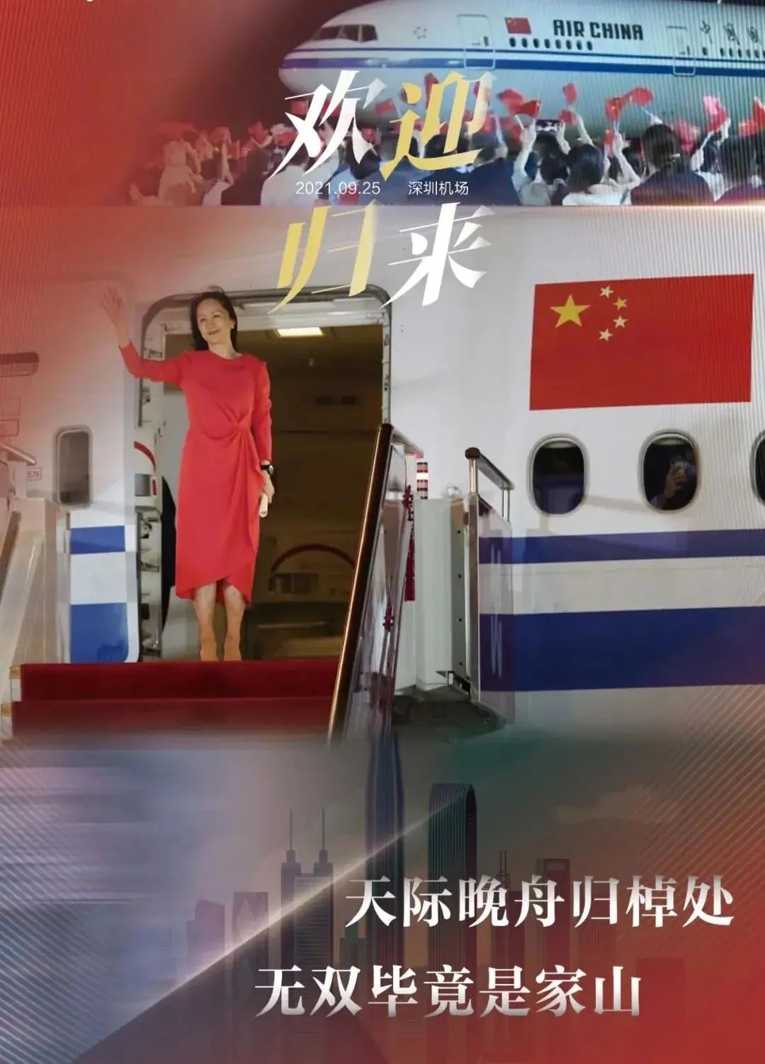 2021年9月25日,中国公民孟晚舟乘坐中国政府包机返回祖国。在回国的飞机上,孟晚舟更新了自己的朋友圈,她在朋友圈写道“感谢亲爱的祖国,感谢党和政府,正是那一抹绚丽的中国红,燃起我心中的信念之火,照亮我人生的至暗时刻,引领我回家的漫长路途”。