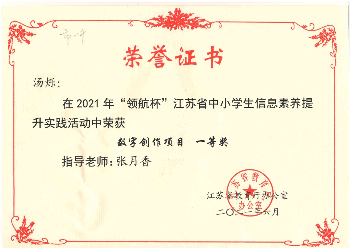 2021年6月,我校学生汤烁在“领航杯”江苏省中小学生信息素养提升实践活动中荣获一等奖,他带着自己的微电影团队用光和影来展示这个大千世界,通过光影超越、视听重构来创意出自己的精神世界。通过对自己身边小事的记录,展现现代学生学习生活中的所思所想,拍摄出《歧途》这一作品。