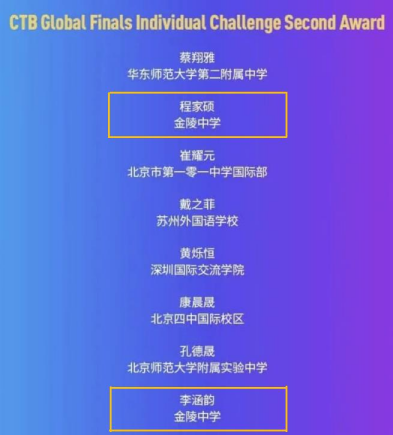 2020-2021年CTB全球创新研究大挑战已经落下帷幕,而这个比赛却永远地刻在了同学们的心中。在这个长达一年之久的比赛中,金陵中学的同学们从零开始完成创意到实践的全过程,第一次写论文,第一次做统计分析,第一次做展板,他们在比赛中迎来了研究初体验,在一次次挫折中历练与成长,证明了即使是高中生也有着无穷的能量,展现了自己有能力参与世界性命题的解答。新一届的CTB大赛即将开始,让我们在祝贺这些获奖选手的同时,也期待新的参赛选手们在比赛中挑战自我,再创辉煌!