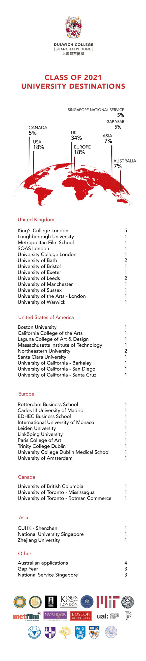尽管我们的学生收到了来自世界各地高校的录取通知书,但每个人的最终选择只能有一个。以下是我校2021届毕业生的录取高校一览。