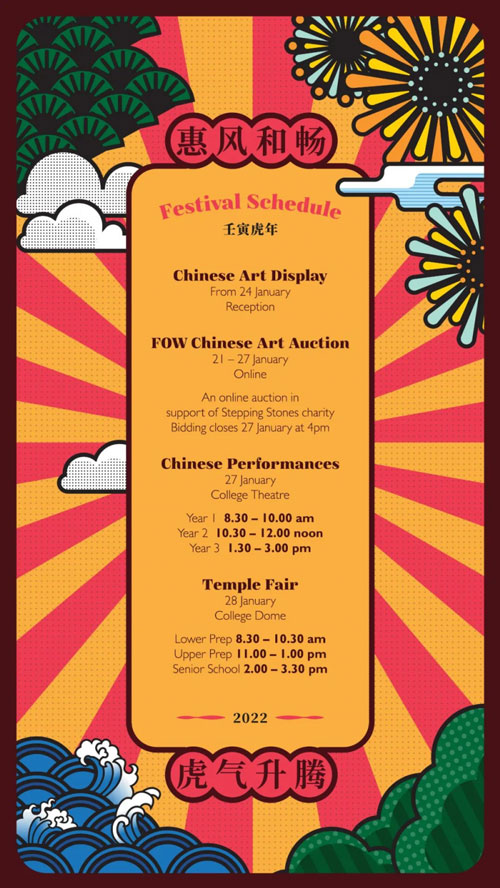 庆祝活动将于 1 月 27 日在我们的主校区继续进行,届时我们 1 至 3 年级的学生将登上舞台,展示大量歌曲和舞蹈的文化展示。当天晚些时候,我们 4-13 年级的学生将参加惠灵顿在圆顶举行的年度庙会。届时将有扇子舞表演、功夫表演和舞狮表演,以及各种中国传统游戏和手工艺品。