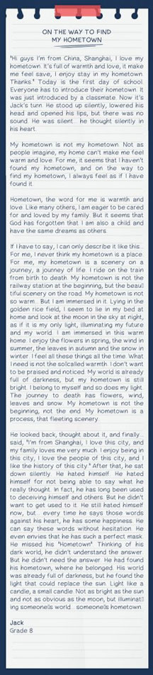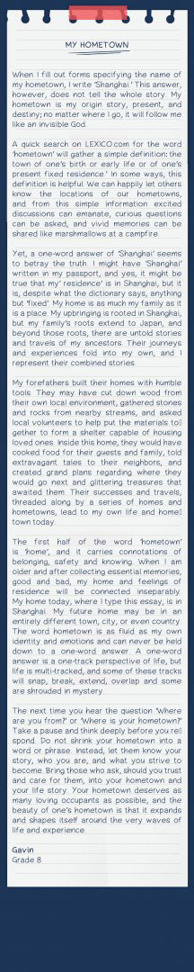 当你想到你的家乡时,你会想到什么?一些人认为他们的家乡是一个起源地或最终目的地,而另一些人则认为这是人生旅途中的一种体验。作为一所接待来自世界各地的学生的国际学校,家乡的概念有些陌生。