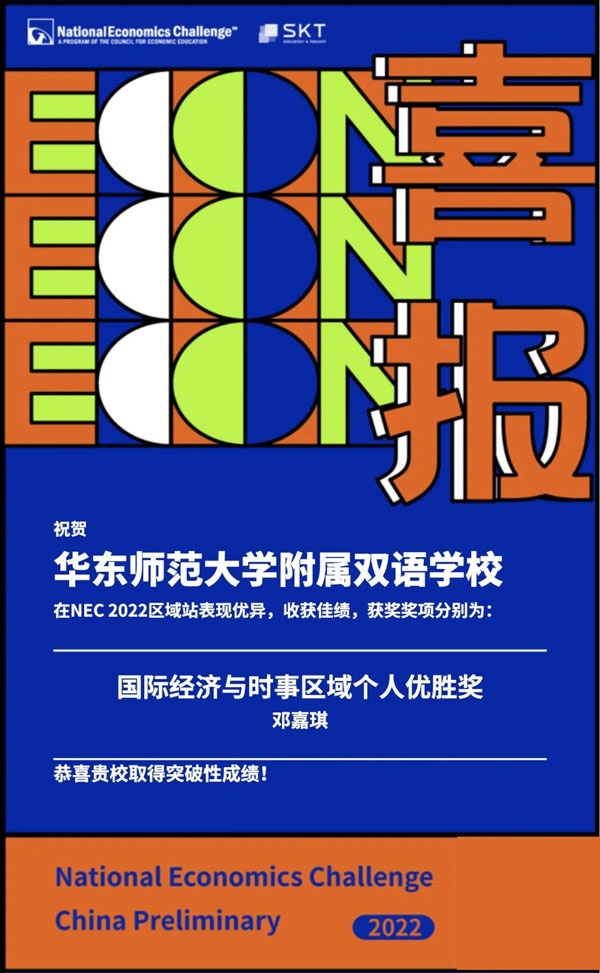 Deng Jiaqi from high School won the regional Individual Prize in International Economics and current affairs in the 2022 National Economics Challenge (NEC). Congratulations to the students and our instructor Ms. Ivy Zhang.