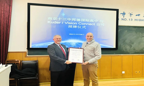 南京十三中国际高中为每一位学生的成人成才负责,去年我校中加班正式引入Kuder系统,我校加方校长Mr. Mantha与Vision Connect公司CEO Andrew Todd先生和首席运营官何戎先生共同举行了授牌仪式。