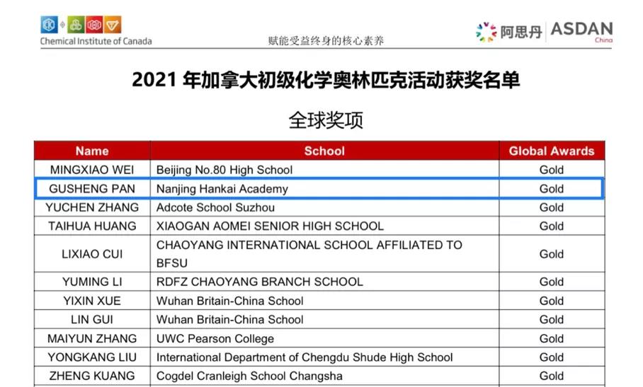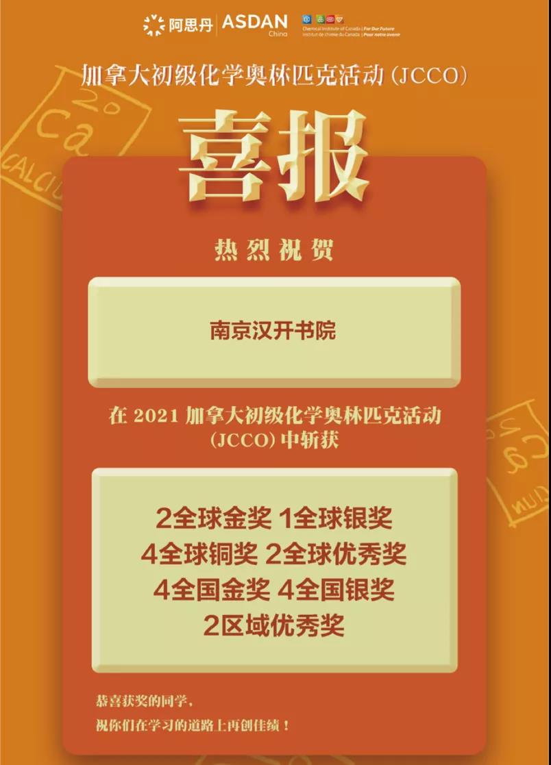 2021年12月18日,阿思丹(ASDAN China)举办的 “加拿大初级化学奥林匹克活动(JCCO)” 在线上及本校同时进行 。南京汉开书院学校的11名学生参与此次活动,获得2枚全球金奖、1枚全球银奖、4枚全球铜奖、2枚全球优秀奖、4枚全国金奖、4枚全国银奖、2枚区域优秀奖的奖牌。