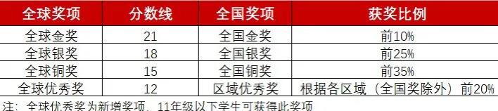 加拿大初级化学奥林匹克活动(JCCO)的奖项设置为:全球金奖(Global Gold)、全球银奖(Global Silver)、全球铜奖(Global Bronze)、全球优秀奖(Global Merit)、全国金奖(Gold)、全国银奖(Silver)、全球铜奖(Bronze)、全国区域优秀奖(Regional Honorable Award),具体详情请看下表。