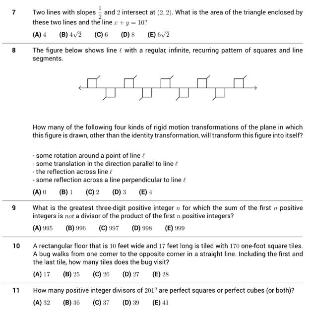 AMC10通常涵盖初三和高一数学课程内容,包括初等代数、基础几何学(勾股定理、面积体积公式等)、初等数论和概率问题。不包括三角函数、高等代数和高等几何学知识。