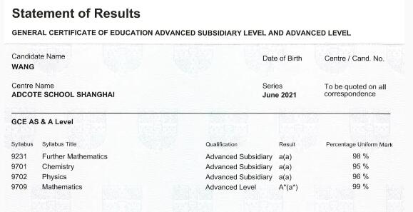 Wang同学在ALevel阶段选择的课程分别取得了数学A*(a*)、高数a(a)、化学a(a)、物理a(a)的成绩。