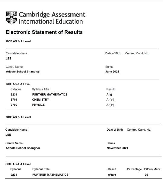 LEE同学在ALevel阶段选择的课程分别取得了高数A*(a*)、物理A*(a*)、化学A*(a*)的成绩。