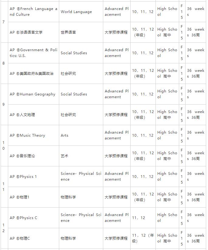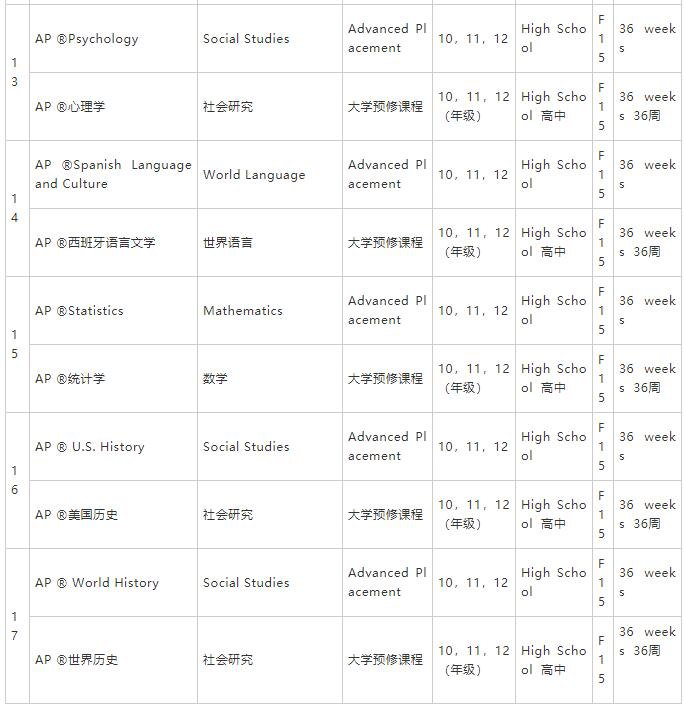 线上AP课程包括:电脑科学、经济、环境科学、欧洲历史、人文地理、音乐理论、心理学、法语语言文学、西班牙语言文学等17门