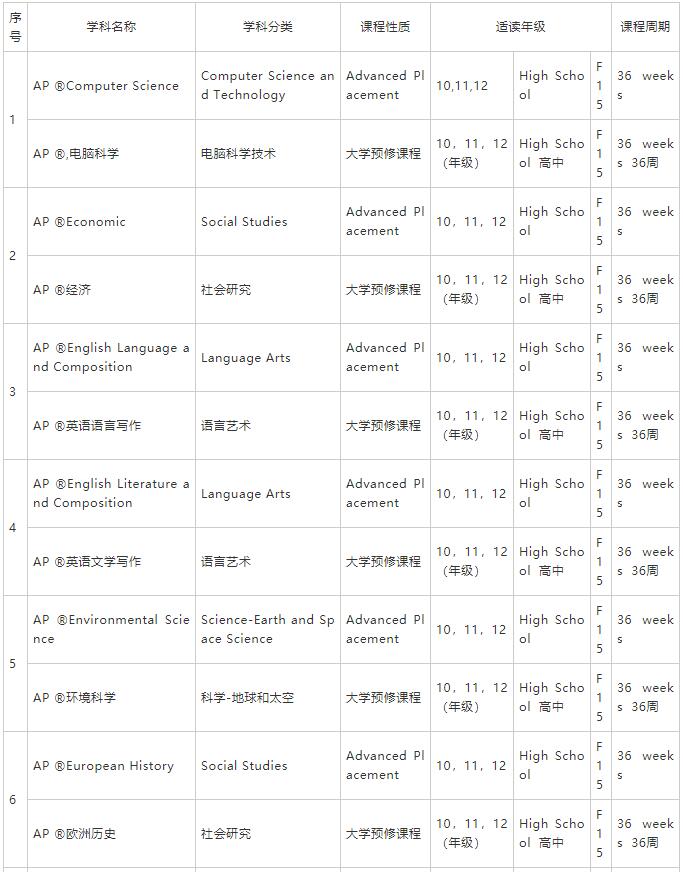 按学生的学术水准和专业兴趣,提供以下15门AP课程的课堂教学和考试备考: