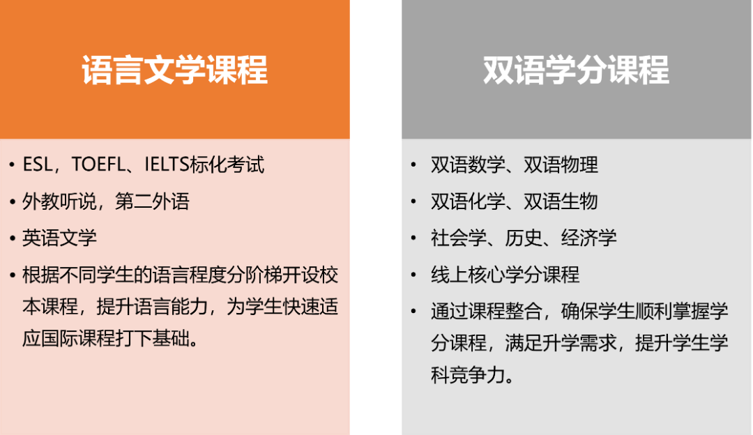 学校秉承着“面向世界,面向未来,发现挖掘学生潜能,鼓励发展个性特长;因材施教,有教无类,培养激发学习兴趣,锤炼提升个人意志”的课程理念,从2011年起先后开设加拿大OSSD、美高AP、香港HKDSE和中日课程。在继承中华优秀文化的基础上,引进海外高中教育资源和体系,为中国学生量身定制融合国际课程,提供全方位的语言和学科教学,高中毕业后,90%学生可入读加拿大前5,美国前80、英国前15、香港前8、澳洲前8等世界大学。全部学生被国外正规四年制本科院校录取。