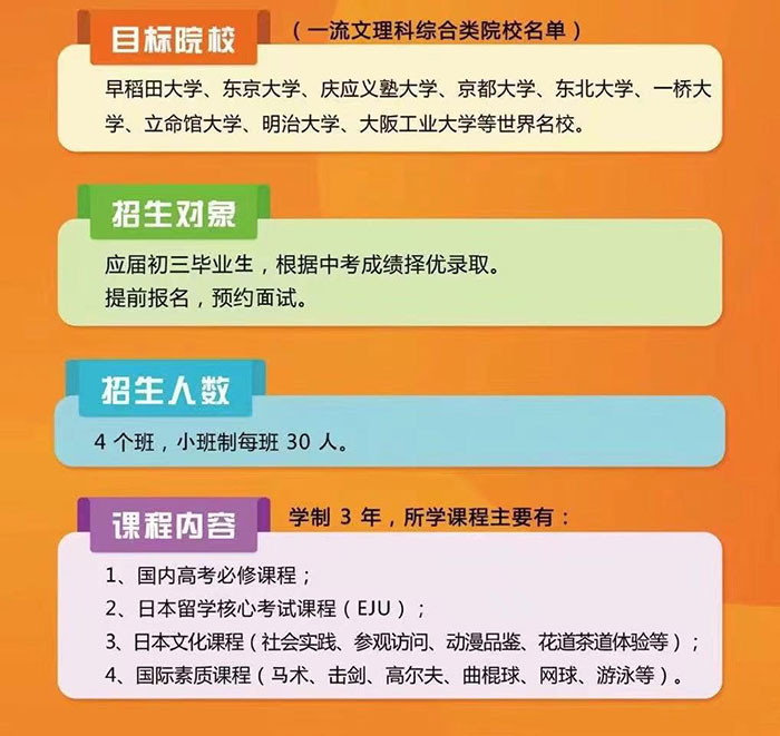 国内3年:在我校区全日制学习3年,直升日本名校(同时可参加国内高考).
