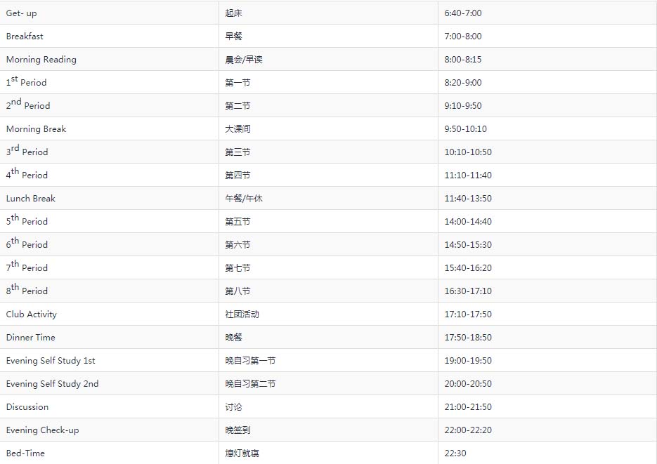 教学上实行纯美高走班制,管理上实行House制(每个House平均分配学生,不论性别、年龄、年级) ,班主任进行周计划(weekly plan)实施监督和常规记录体系 (class record) 包括上课、作业、纪律等;晚自习时间(周一到周四、及周日)为下午18:30 - 22:00,每个House均有中外教值班进行监督。